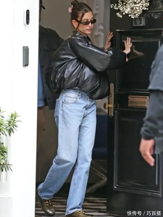 穿搭公式:短款皮衣+九分直筒牛仔+马丁靴